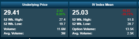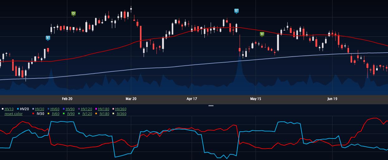 In the lower section of the chart depicted above, the interchanging lines represent implied and historical volatility. The light blue line corresponds to historical volatility (HV), while the red line represents implied volatility (IV).